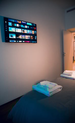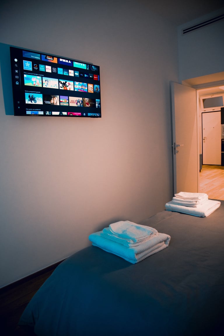 Accogliente camera matrimoniale con vista sulla piazza, dotata di tutti i comfort necessari per un soggiorno rilassante nel cuore di Testaccio.